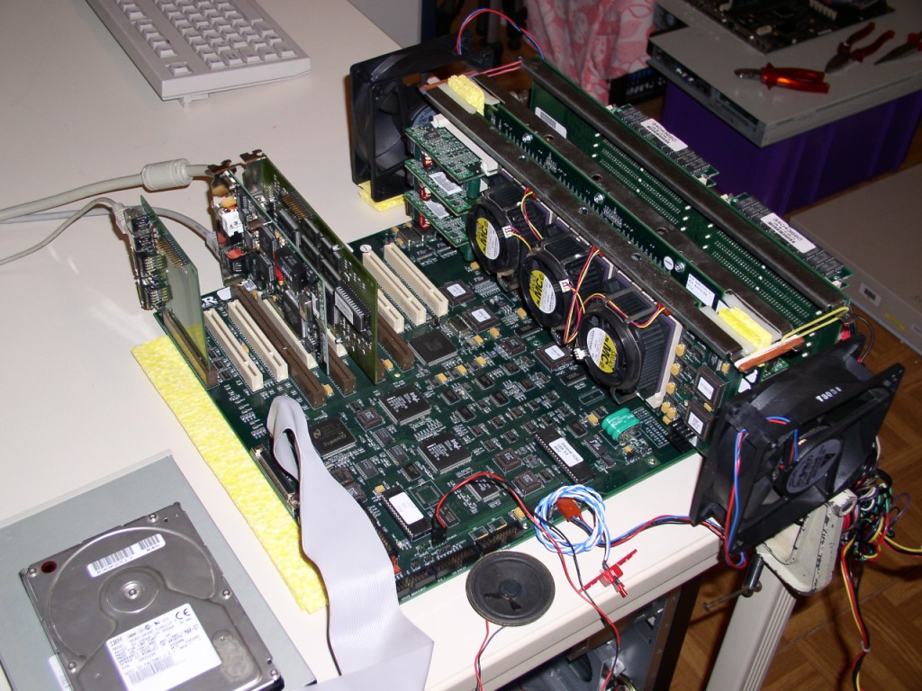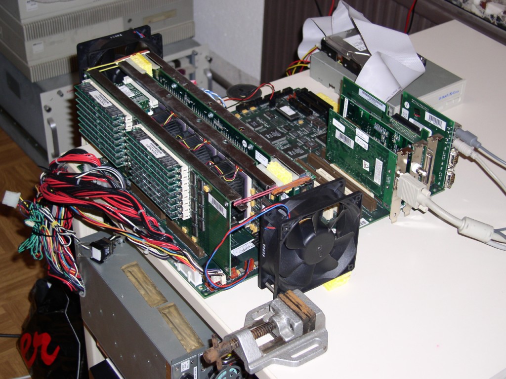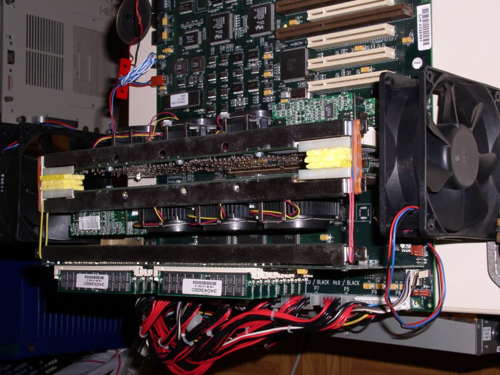 Und hier sehen wir alle eingebauten Steckkarten. Leider war die Intel EtherExpress EISA nicht stabil (wohl eine Fehlkonfiguration meinerseits?), daher hier nur PCI Karten. Von oben nach unten sind dies:
